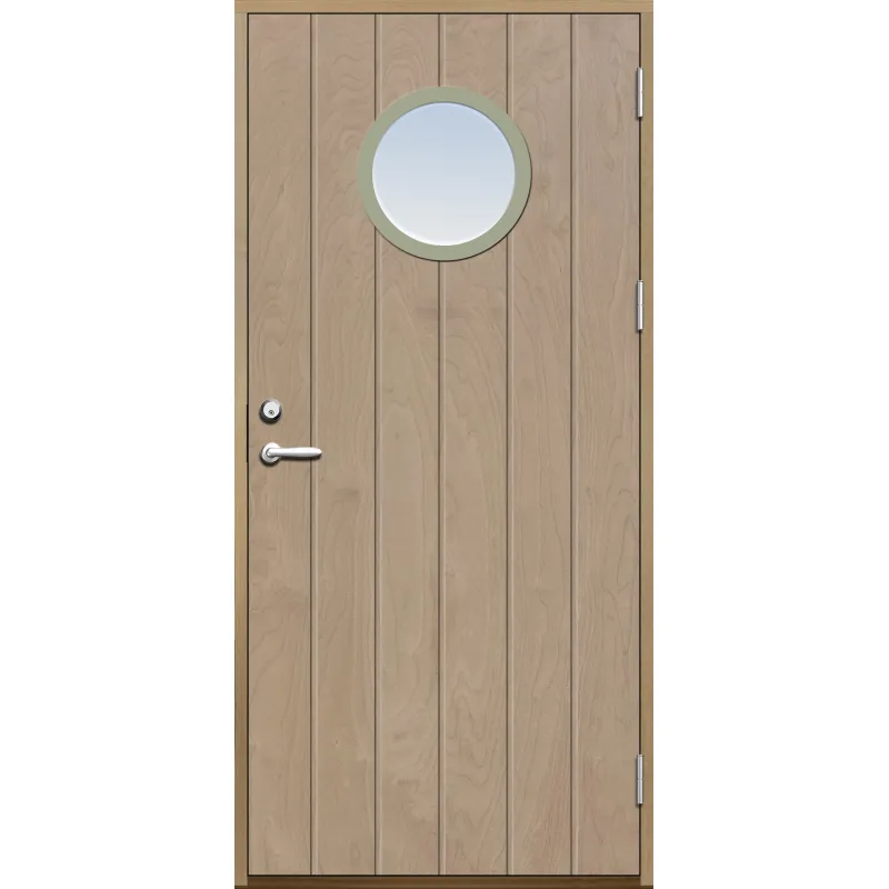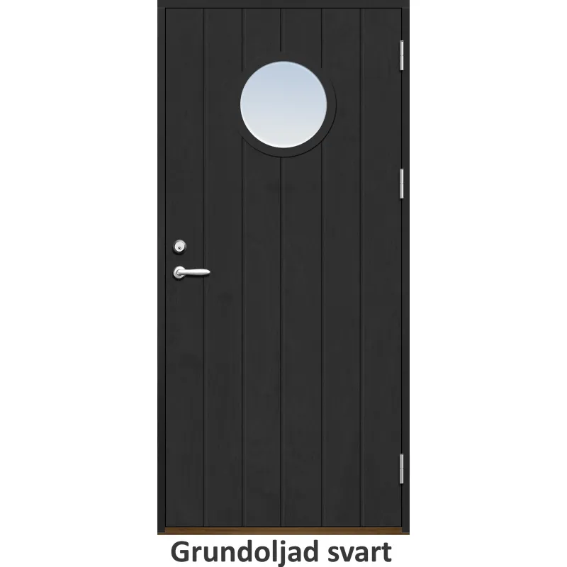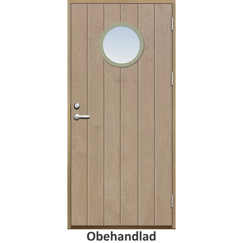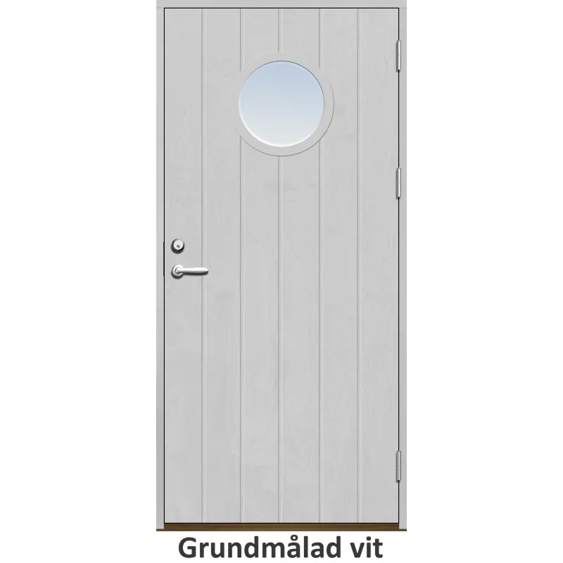 Ytterdörr med utvändiga skivor av HDF med bred stående spårning och runt glas i 21 graders utförande..
