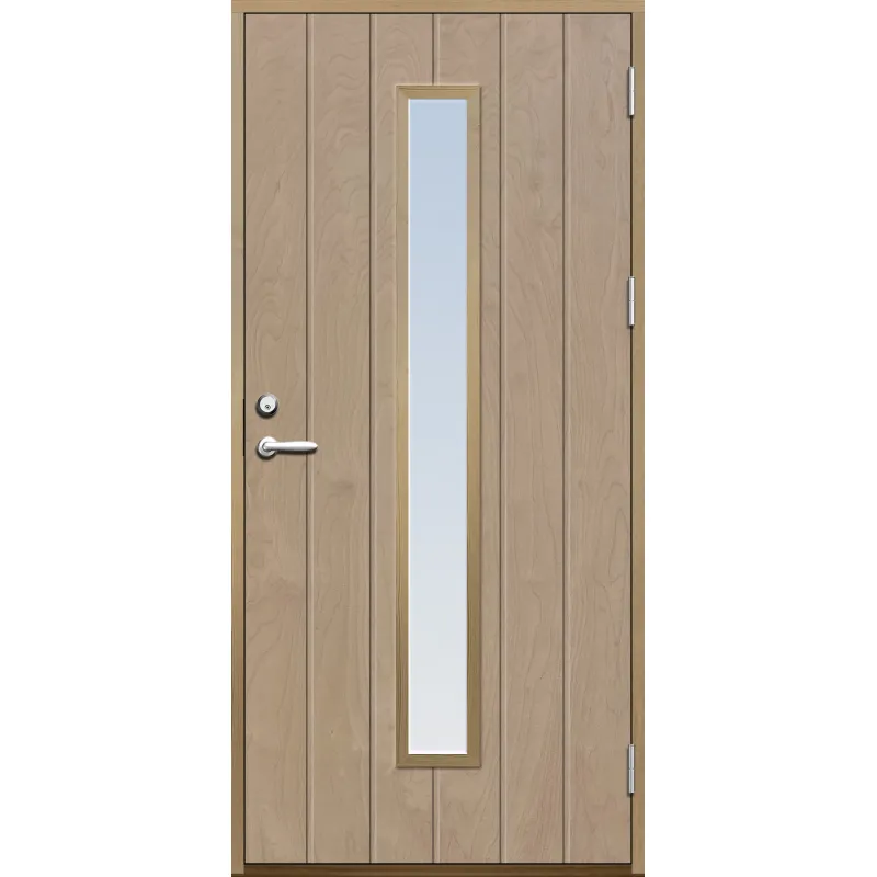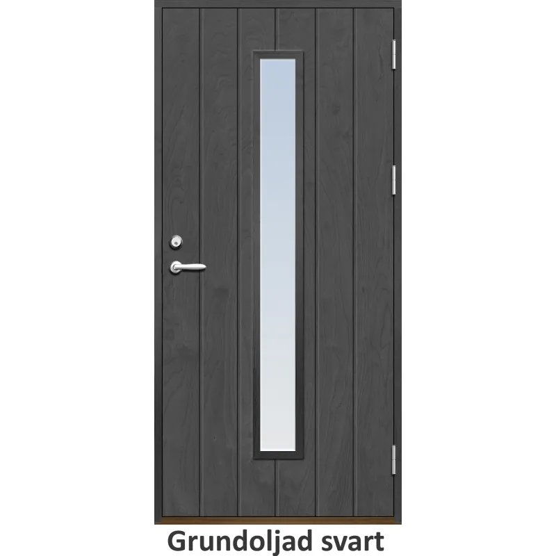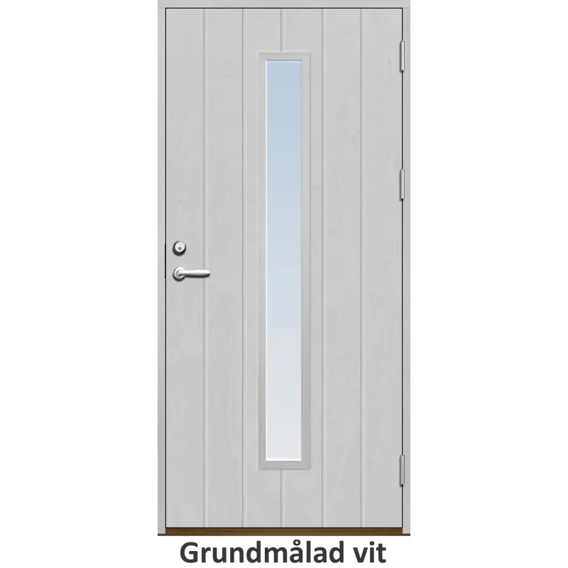 Ytterdörr med utvändiga skivor av HDF med bred stående spårning och glasparti i 21 graders utförande..