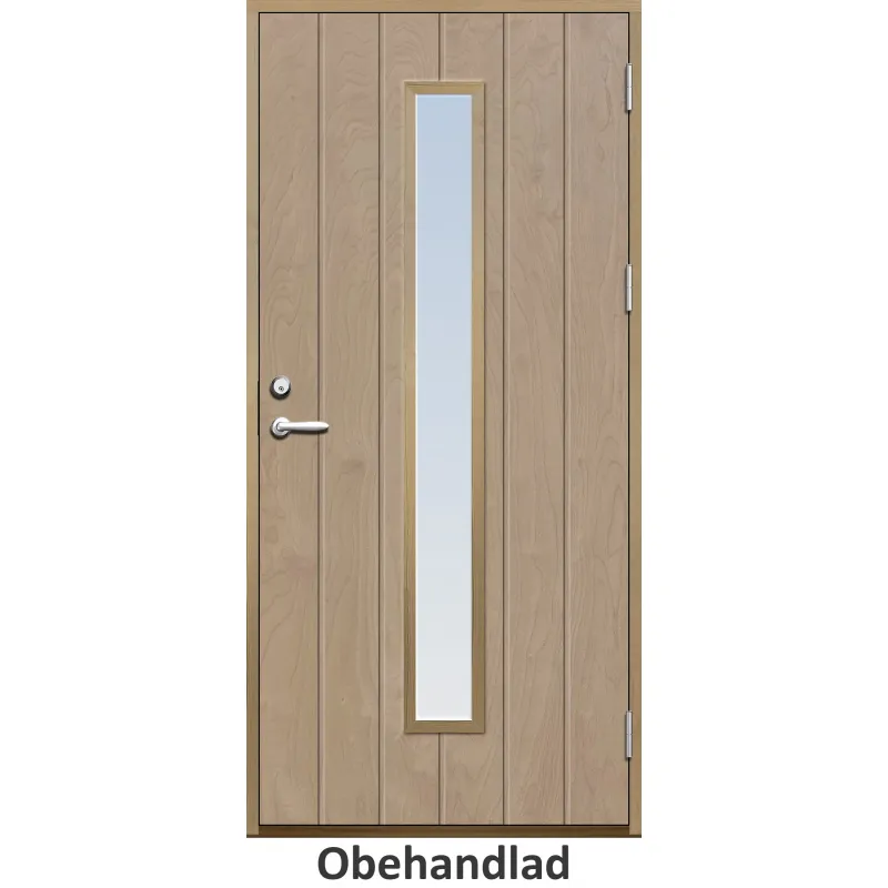 Ytterdörr med bred stående spårning och centrerat avlångt glas.Rejäla dörrblad med tjocklek på 73 mm..