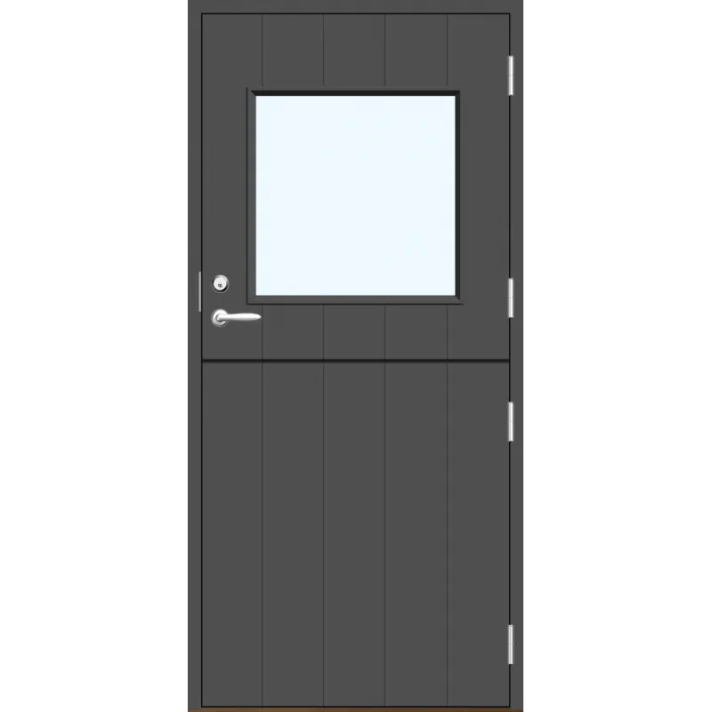 Vacker halvytterdörr Klas med lodrät spårfräsning och stort glasparti.
