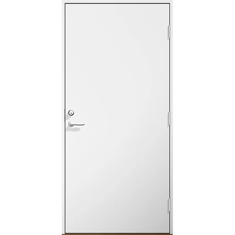 Svensktillverkad slät Källardörr tjocklek dörrblad 69 mm med 60 mm isolering samt metallplåtsinlägg för ökad formstabilitet.