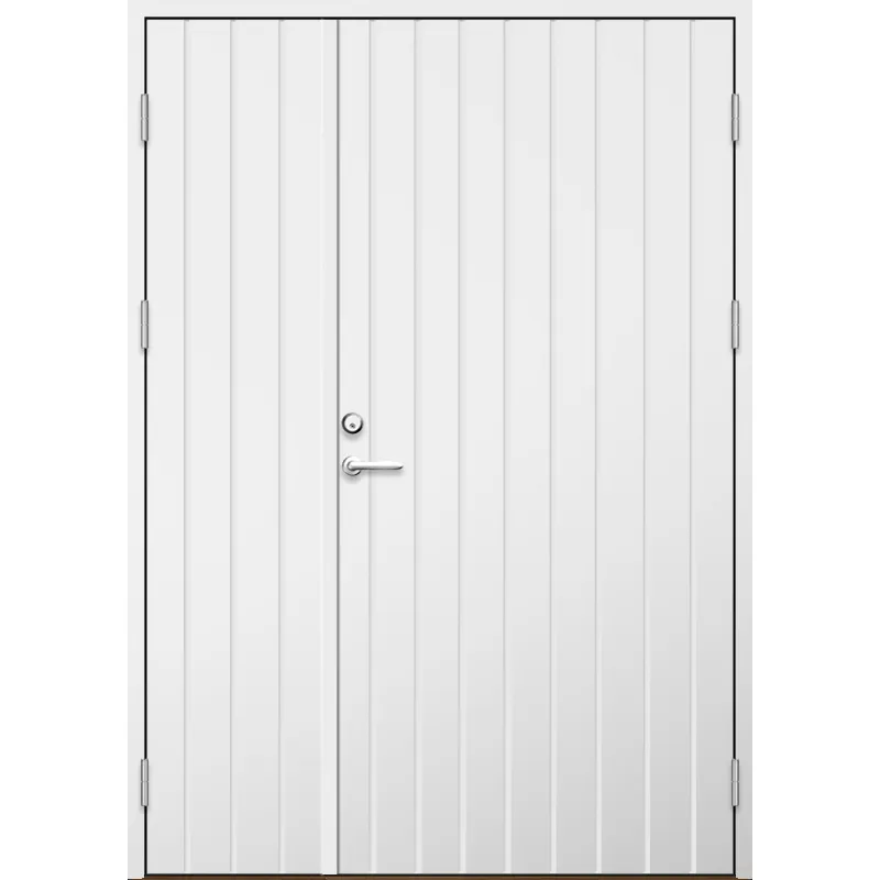 Parförrådsdörr med utvändiga skivor av HDF med tät stående spårning i 18 graders utförande.Med kraft..