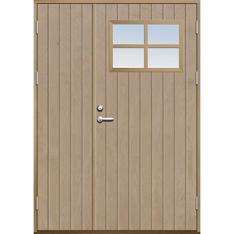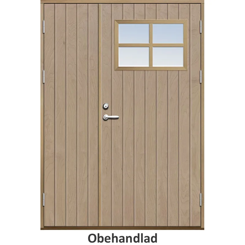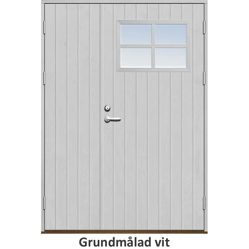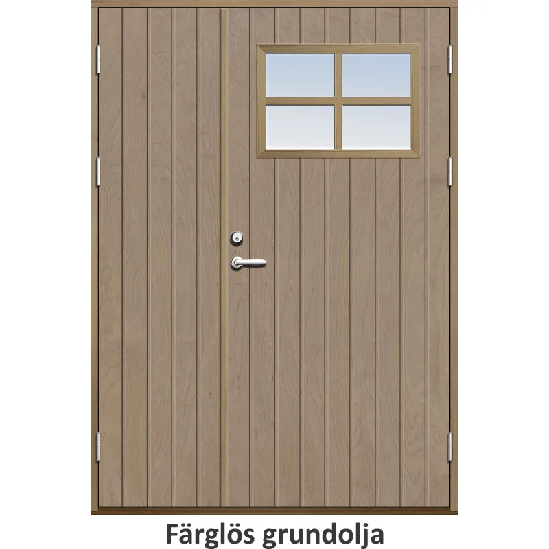 Parytterdörr med utvändiga skivor av HDF med tät stående spårning och glasparti i 21 graders ut..