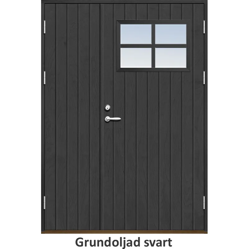 Parförrådsdörr till uppvärmda utrymmen med tät stående spårning och glasparti med spröjsRejäla dörrb..