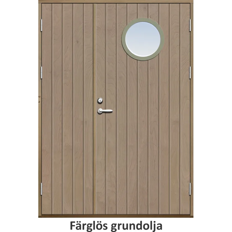Parförrådsdörr med utvändiga skivor av HDF med tät stående spårning och runt glas i 18 graders utför..