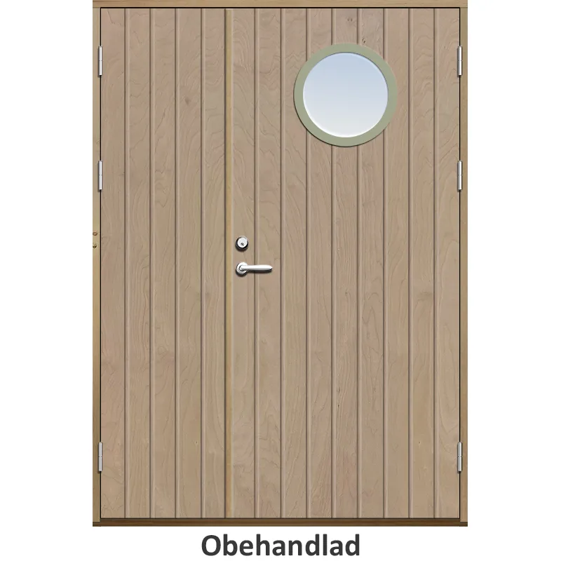 Ytterdörr med tät stående spårning och runt glas.Rejäla dörrblad med tjocklek på 76 mm, inbyggda dub..