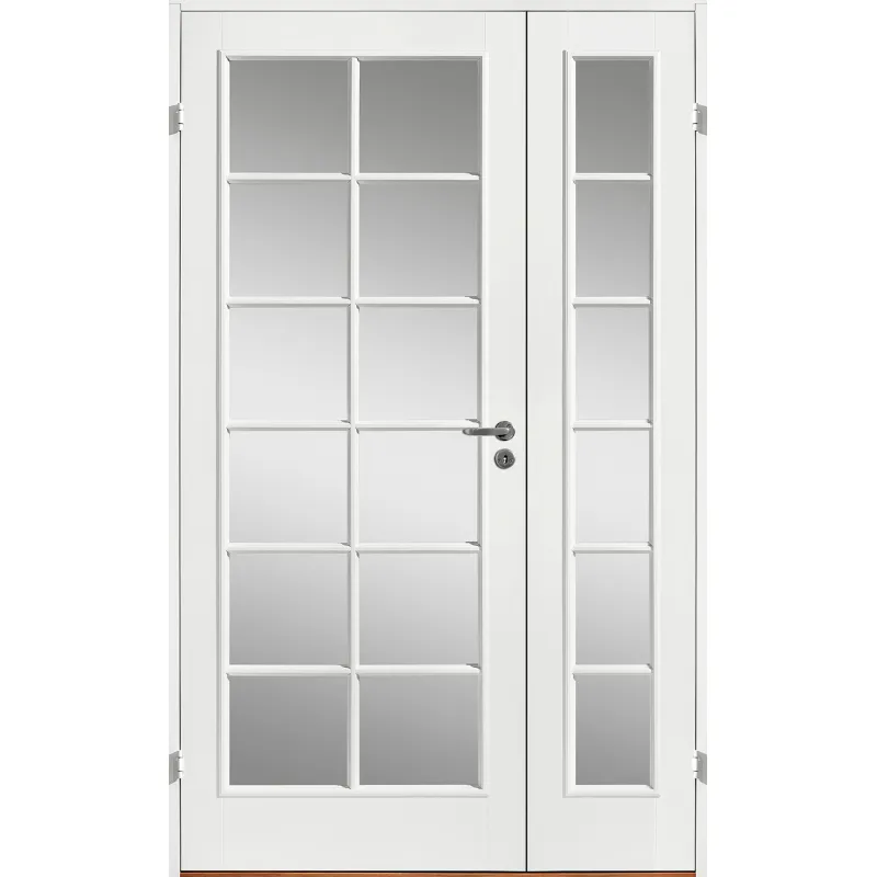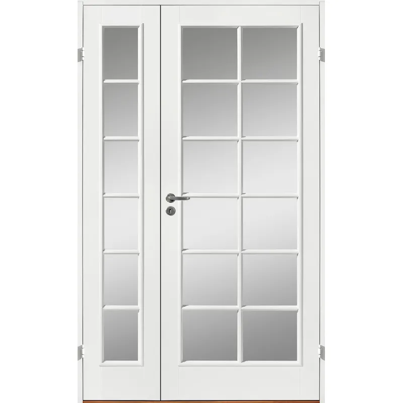 Svensktillverkad vitlackerad parinnerdörr med dekorskiva i kompaktutförande med stort glasparti och spröjs som ger 12 rutor i gångdörren och 6 rutor i anslagsdörren.