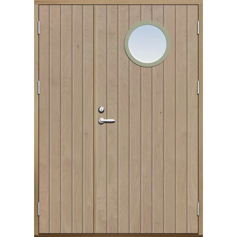Ytterdörr med tät stående spårning och runt glas.Rejäla dörrblad med tjocklek på 76 mm, inbyggda dub..