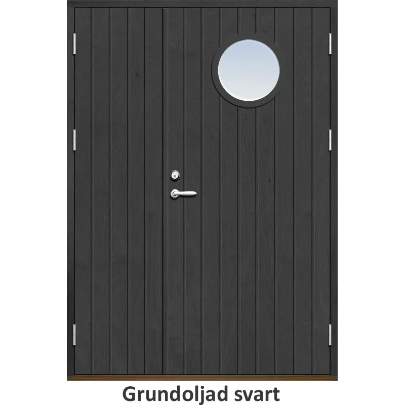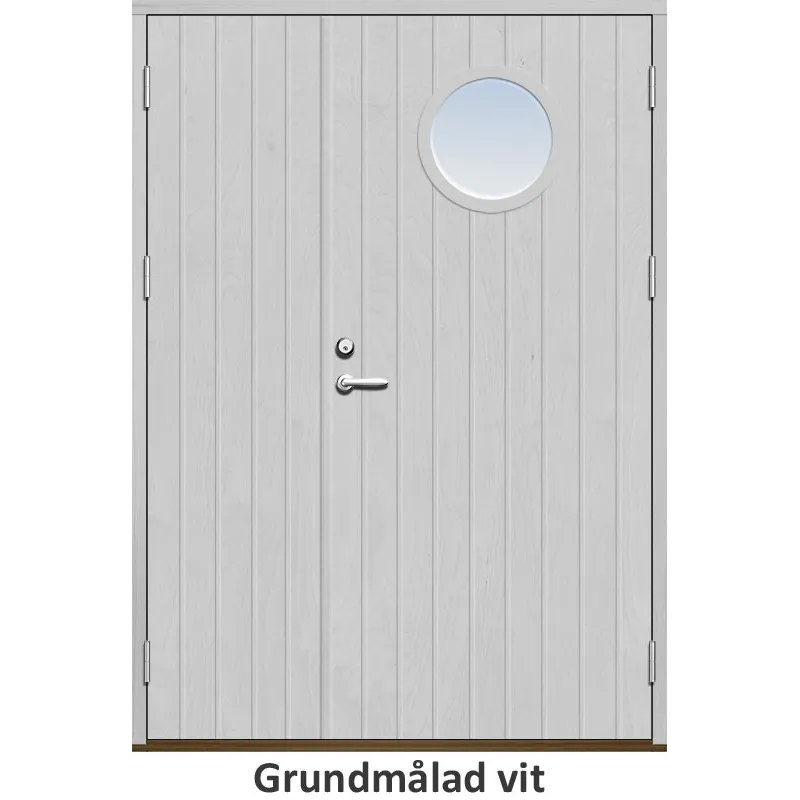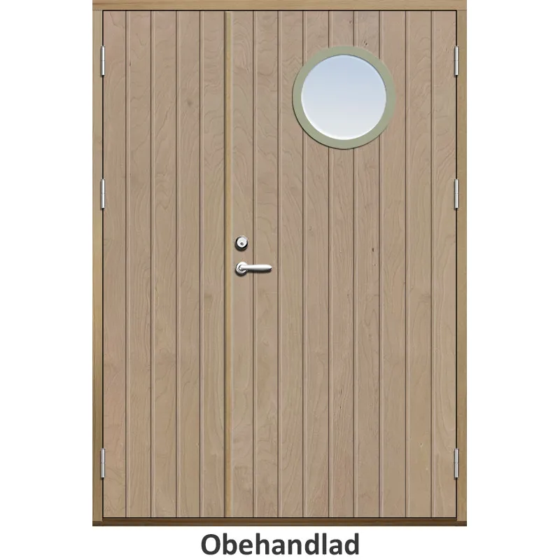 Parförrådsdörr med utvändiga skivor av HDF med tät stående spårning och runt glas i 18 graders utför..