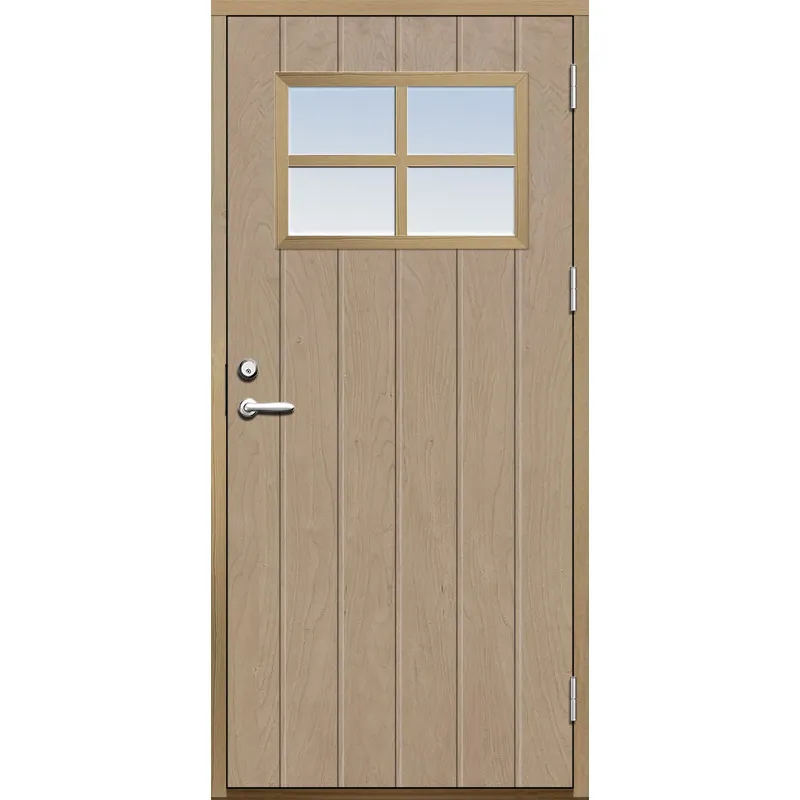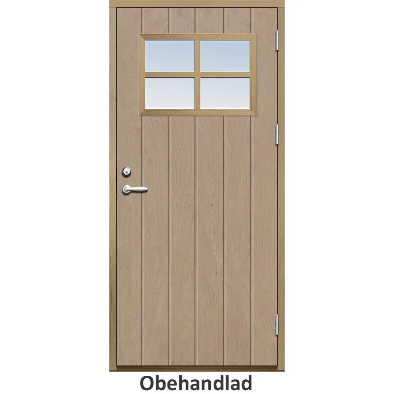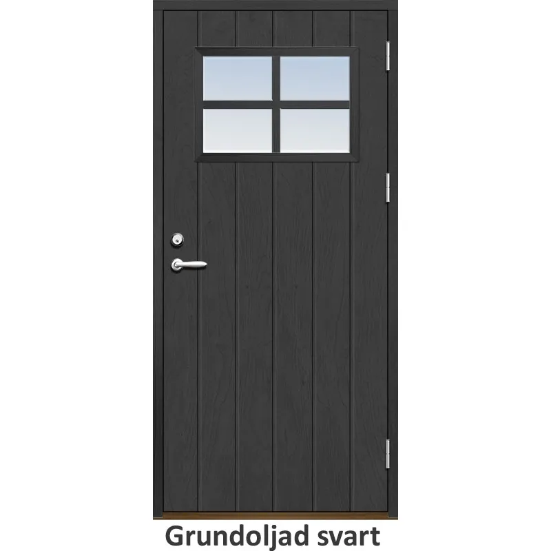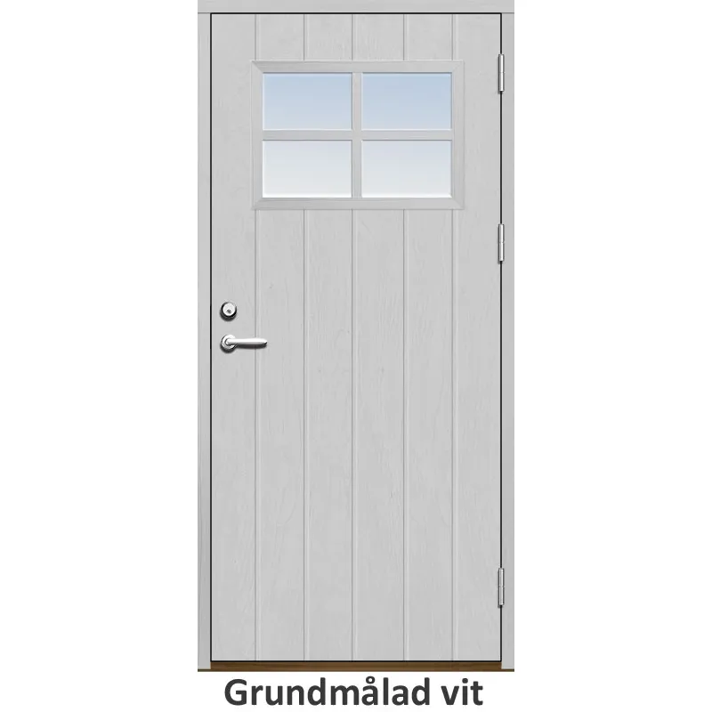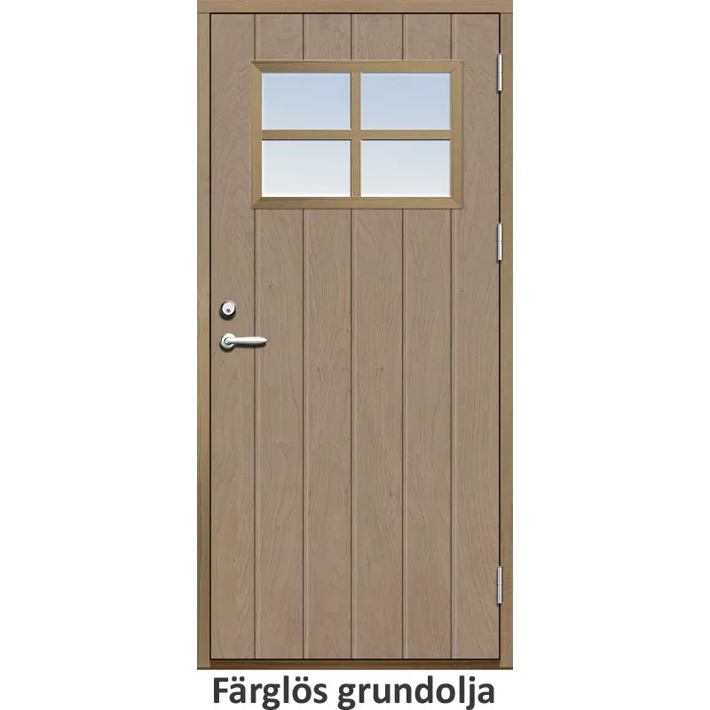Ytterdörr med utvändiga skivor av HDF med bred stående spårning och glasparti i 21 graders utförande..