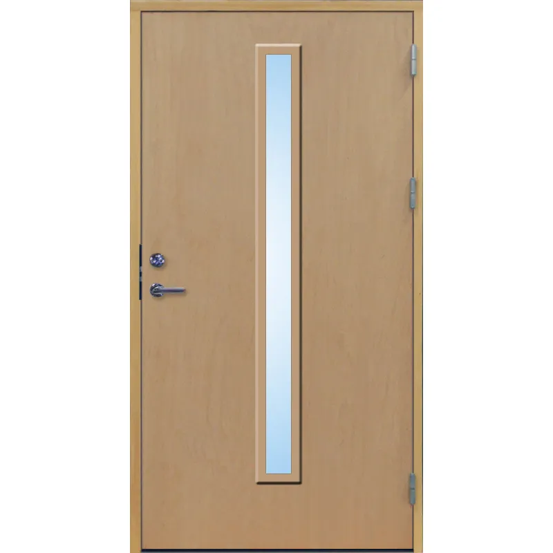 Ytterdörr med slät yta och centrerat avlångt glas.