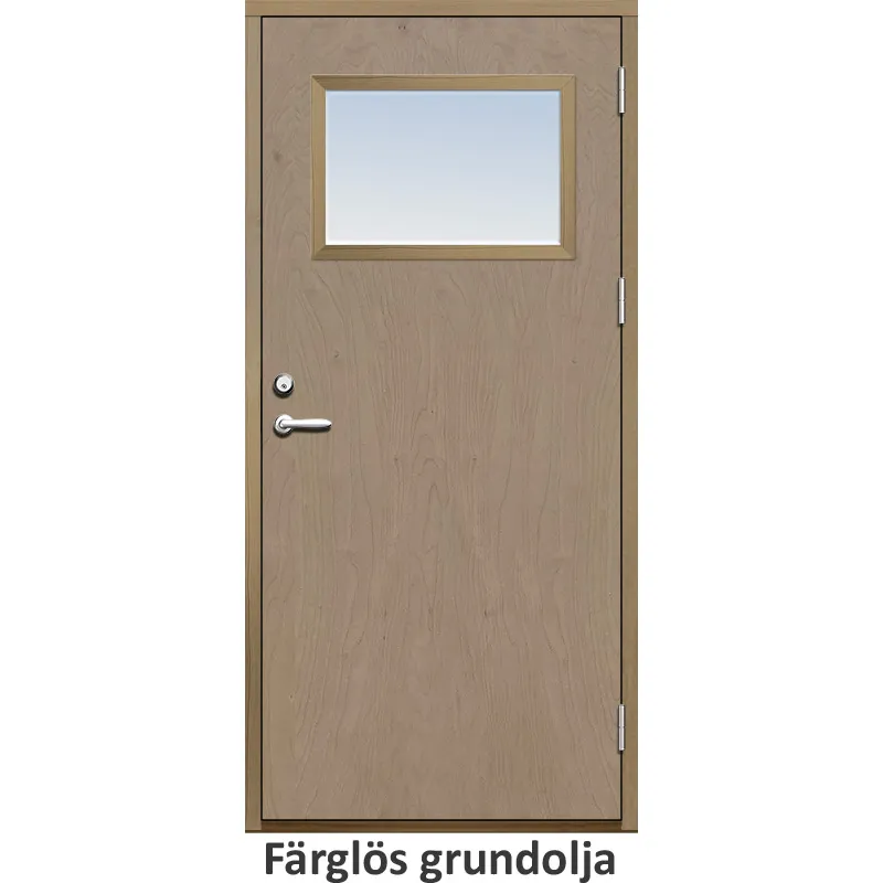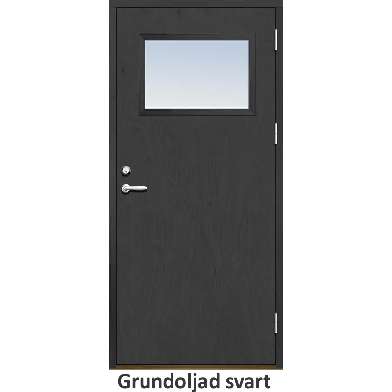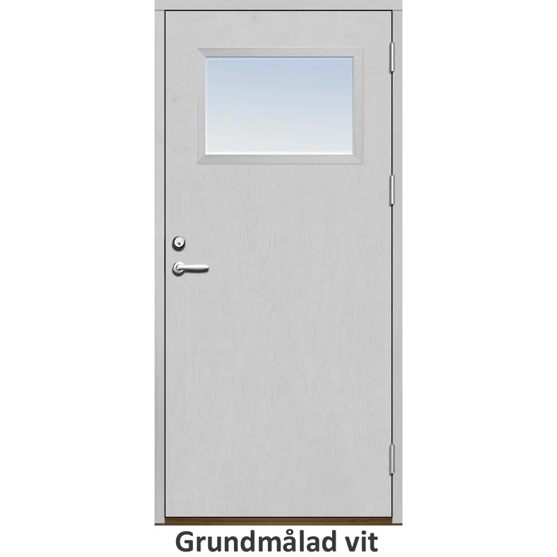 Förrådsdörr med utvändiga skivor av HDF med slät yta och glasparti i 18 graders utförande.Med krafti..