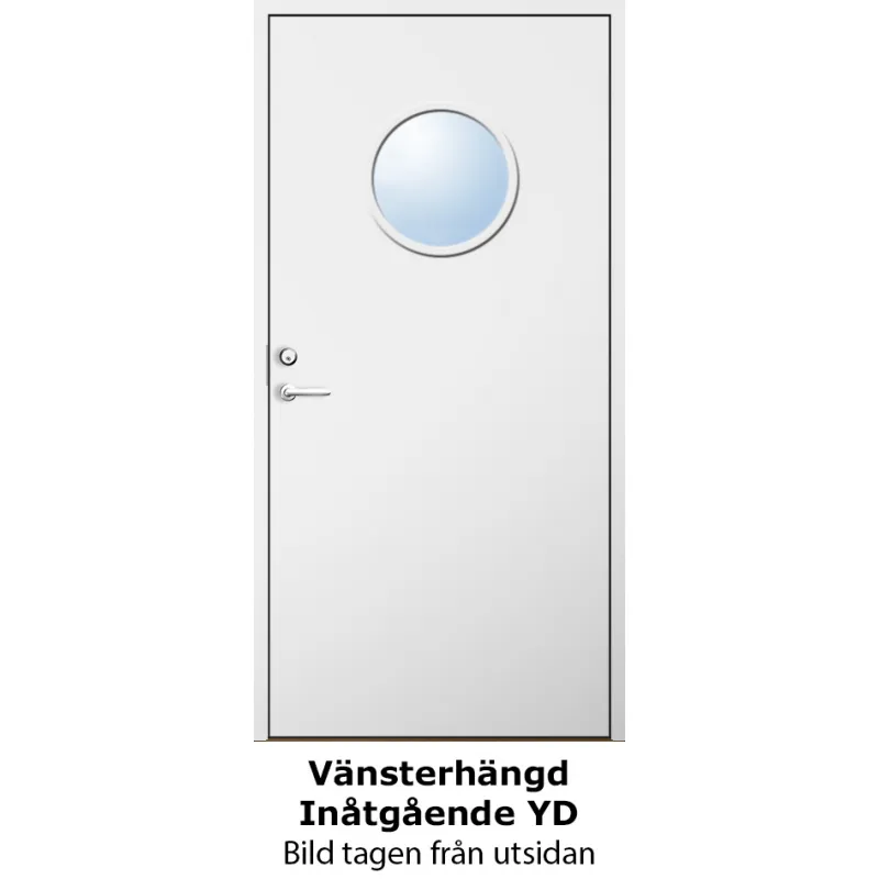 Förrådsdörr med slät yta och runt glas i 18 graders konstruktion.Med kraftig konstruktion, tjocka dö..