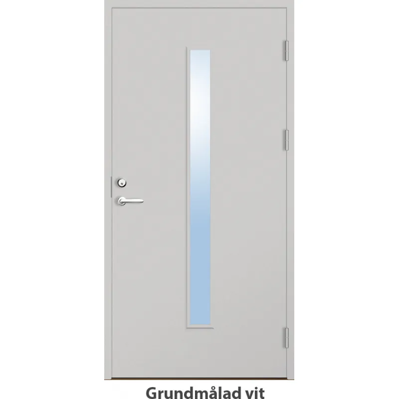 Ytterdörr med utvändiga skivor av HDF med slät yta och centrerat glas i funkisstil i 21 graders utfö..