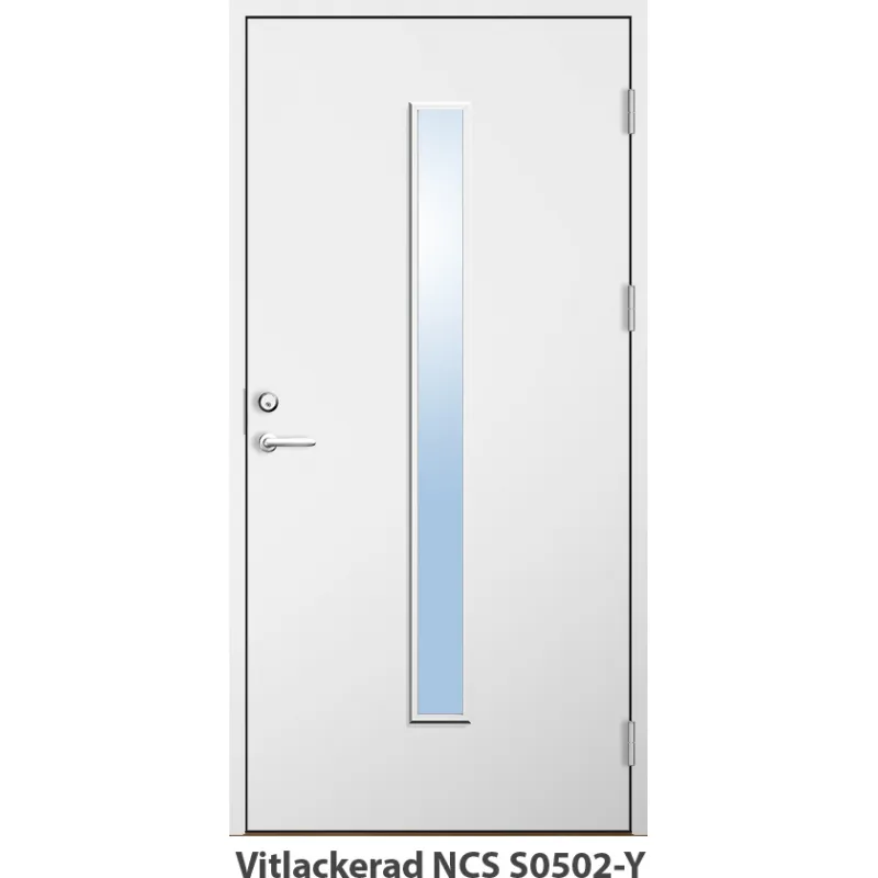 Förrådsdörr i funkisstil med avlångt cenctrerat glas i 18 graders utförande.Med kraftig konstruktion..