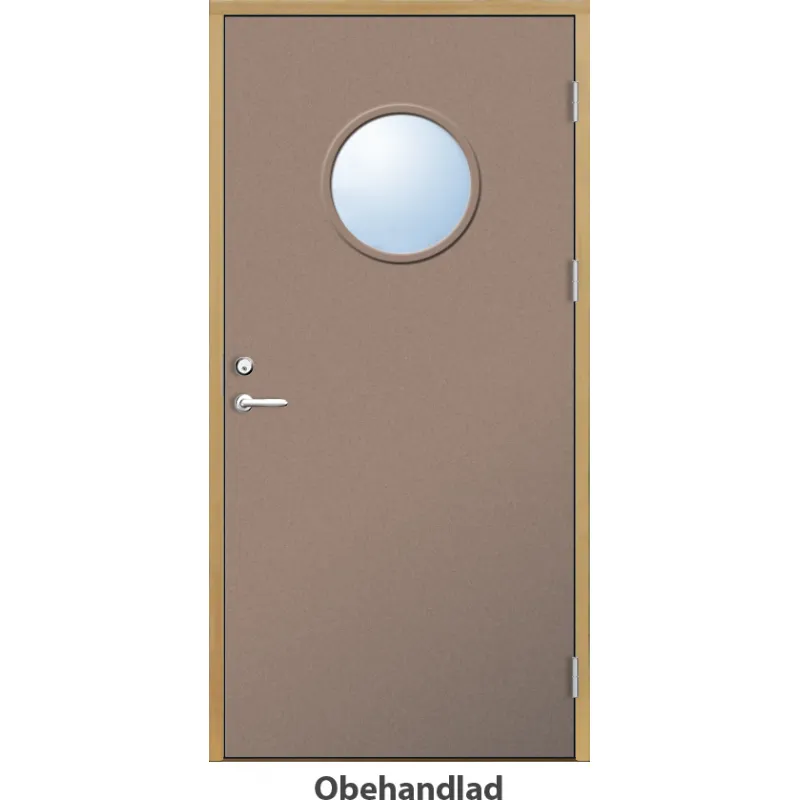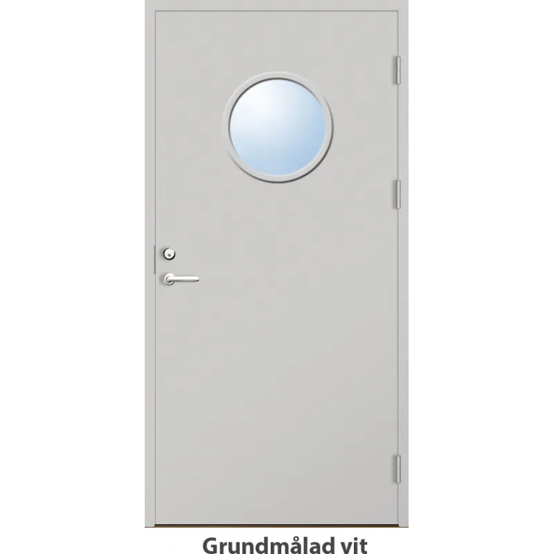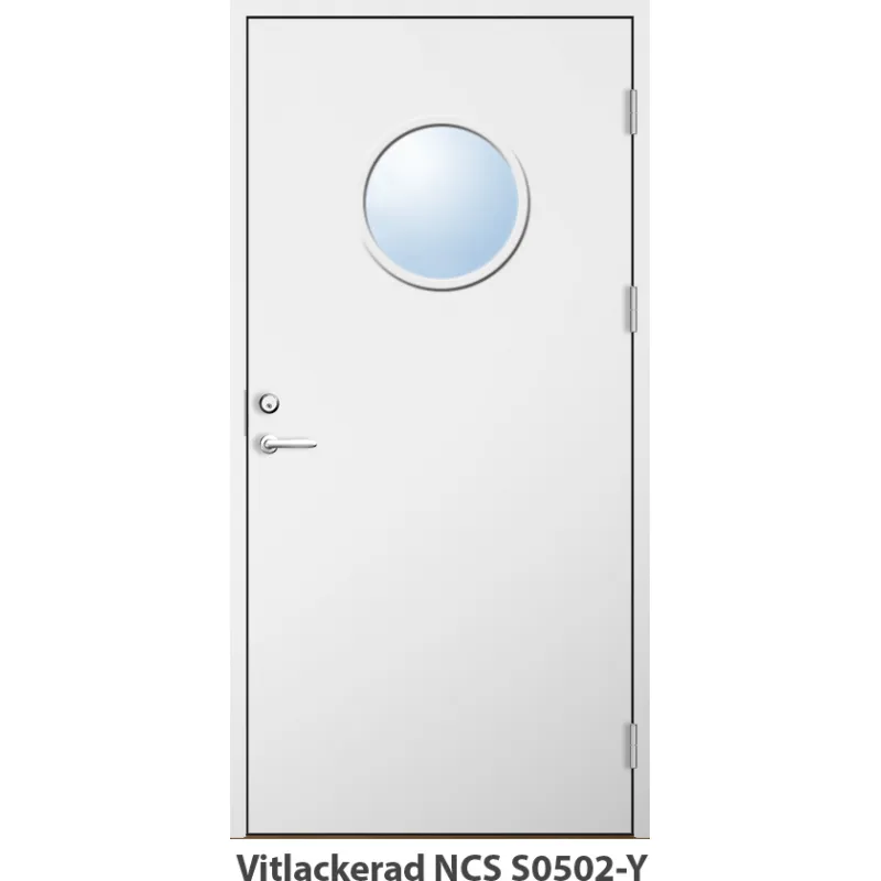 Förrådsdörr med slät yta och runt glas i 18 graders konstruktion.Med kraftig konstruktion, tjocka dö..