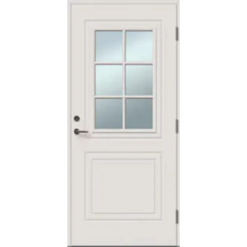 Traditionell ytterdörr med stående spårning och ett stort glasparti med metallplåtsinlägg för ökad f..