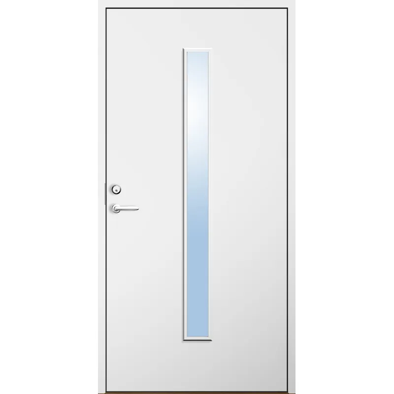 Ytterdörr med slät yta och centrerat avlångt glas.Rejäla dörrblad med tjocklek på 73 mm, inbyggda du..