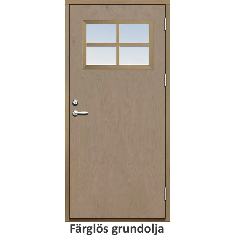 Förrådsdörr med utvändiga skivor av HDF med slät yta och glasparti i 18 graders utförande.Med krafti..
