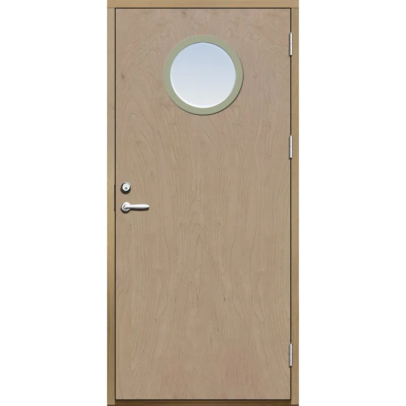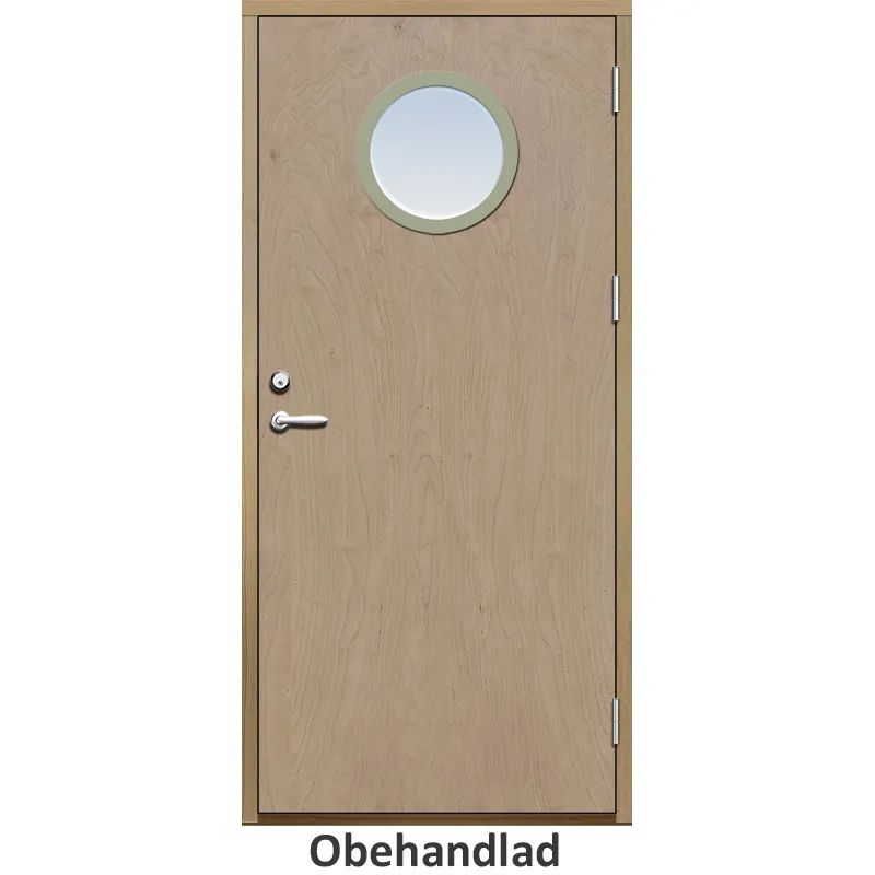 Förrådsdörr med slät yta och runt glas i 18 graders konstruktion.Med kraftig konstruktion, tjocka dö..
