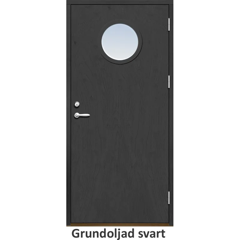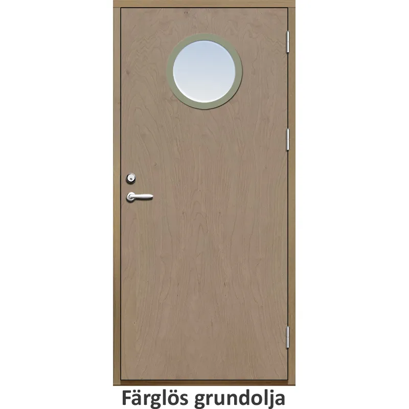 Ytterdörr med slät yta och runt glas.