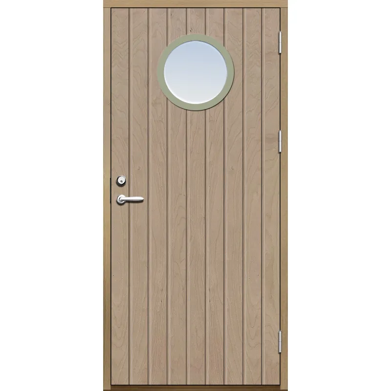 Ytterdörr (inåtgående) med utvändiga skivor av HDF med tät stående spårning och runt glas.Med krafti..