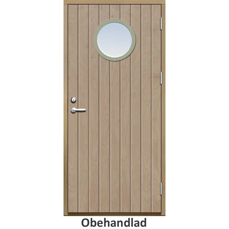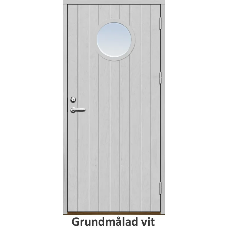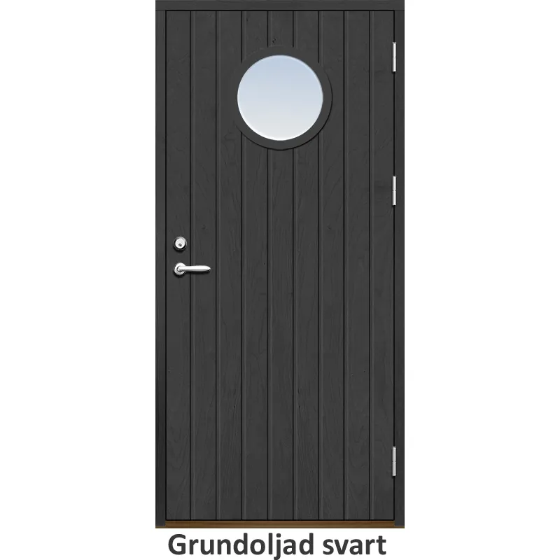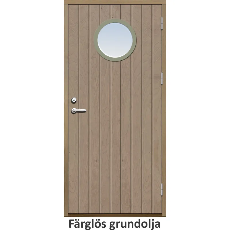 Ytterdörr med tät stående spårning och runt glas.