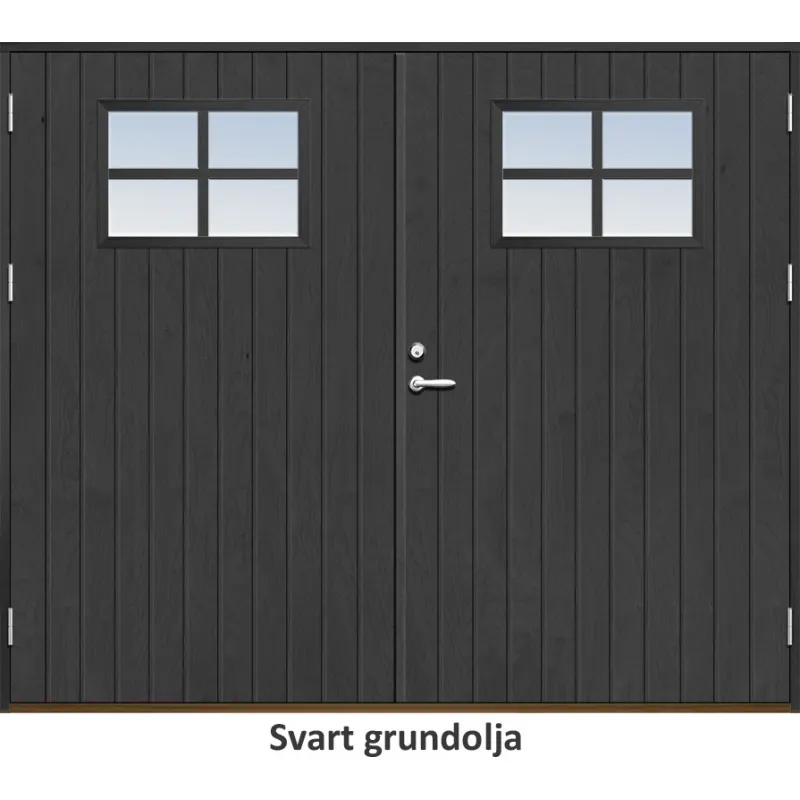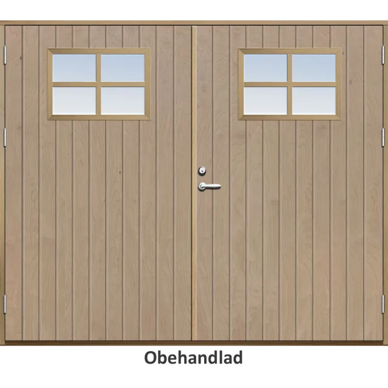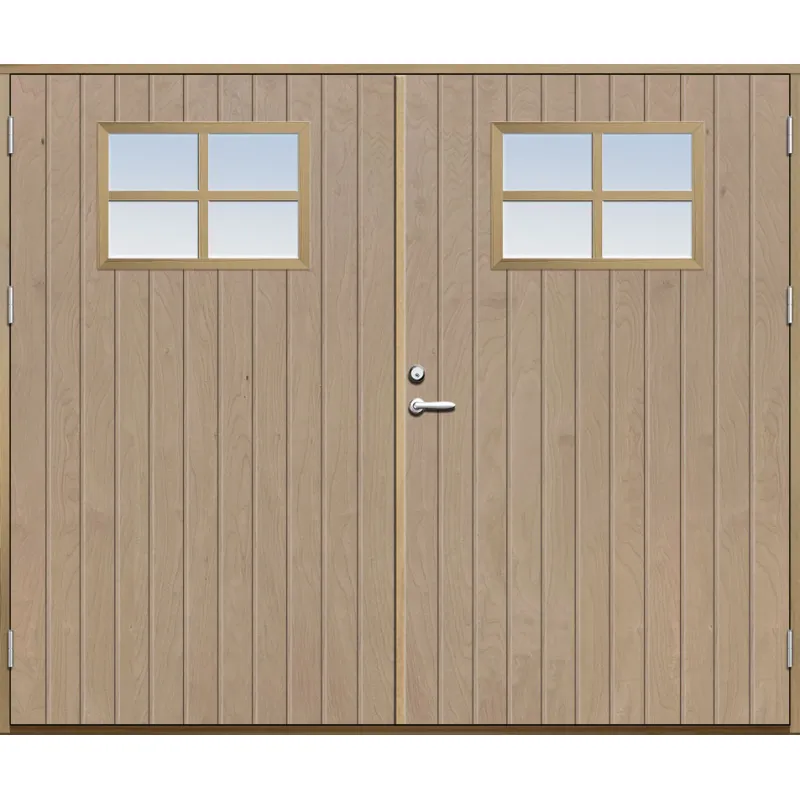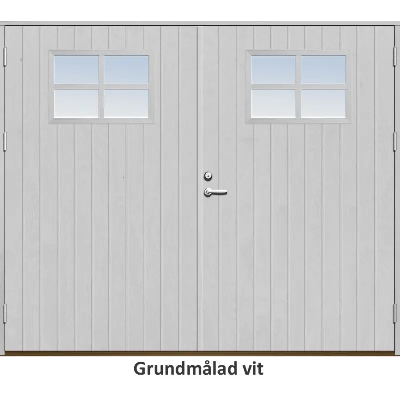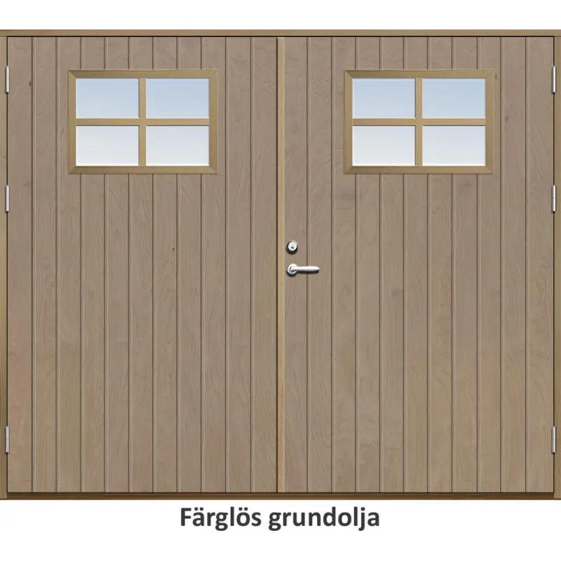 Parytterdörr med utvändiga skivor av HDF med tät stående spårning och glasparti i 21 graders ut..