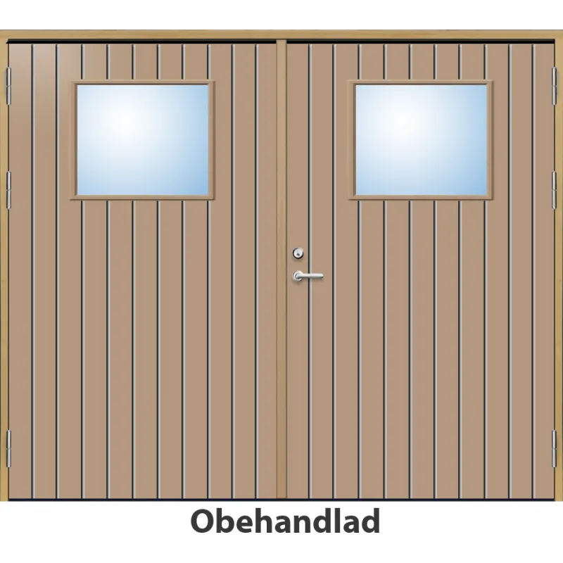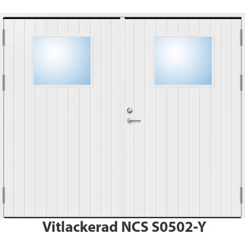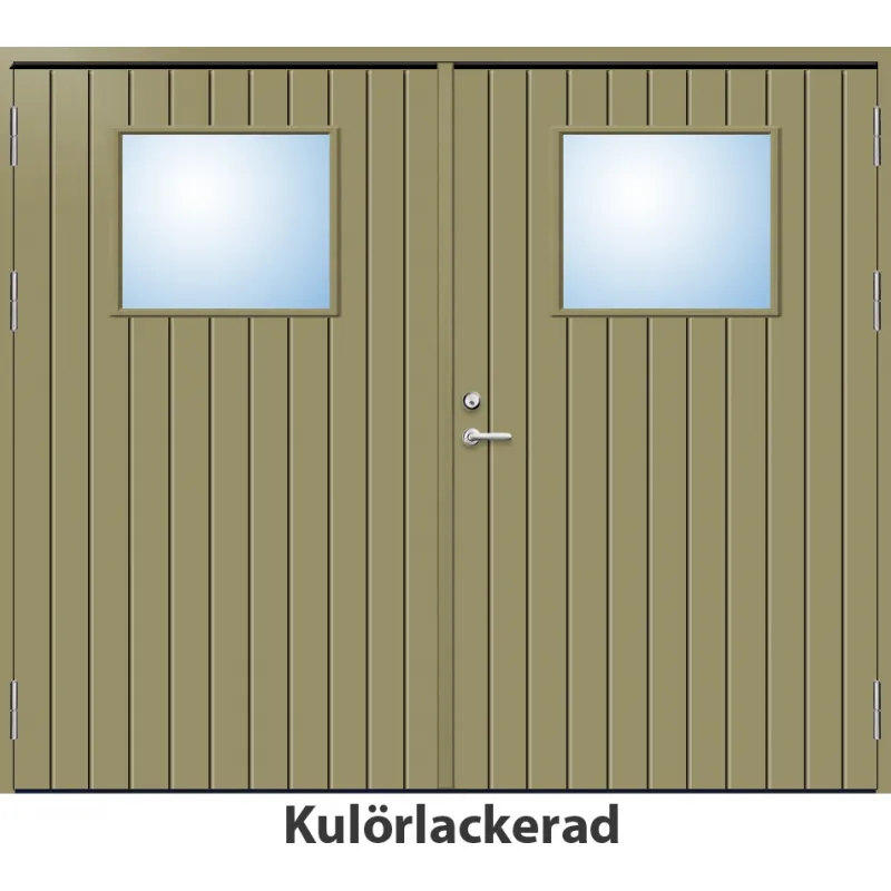 Parytterdörr med utvändiga skivor av HDF med tät stående spårning och glasparti i 21 graders ut..