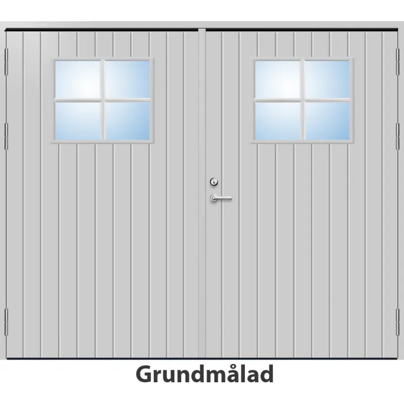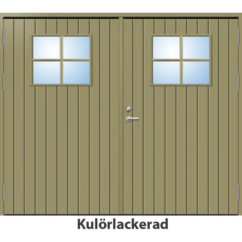 Parytterdörr med utvändiga skivor av HDF med tät stående spårning och glasparti i 21 graders ut..