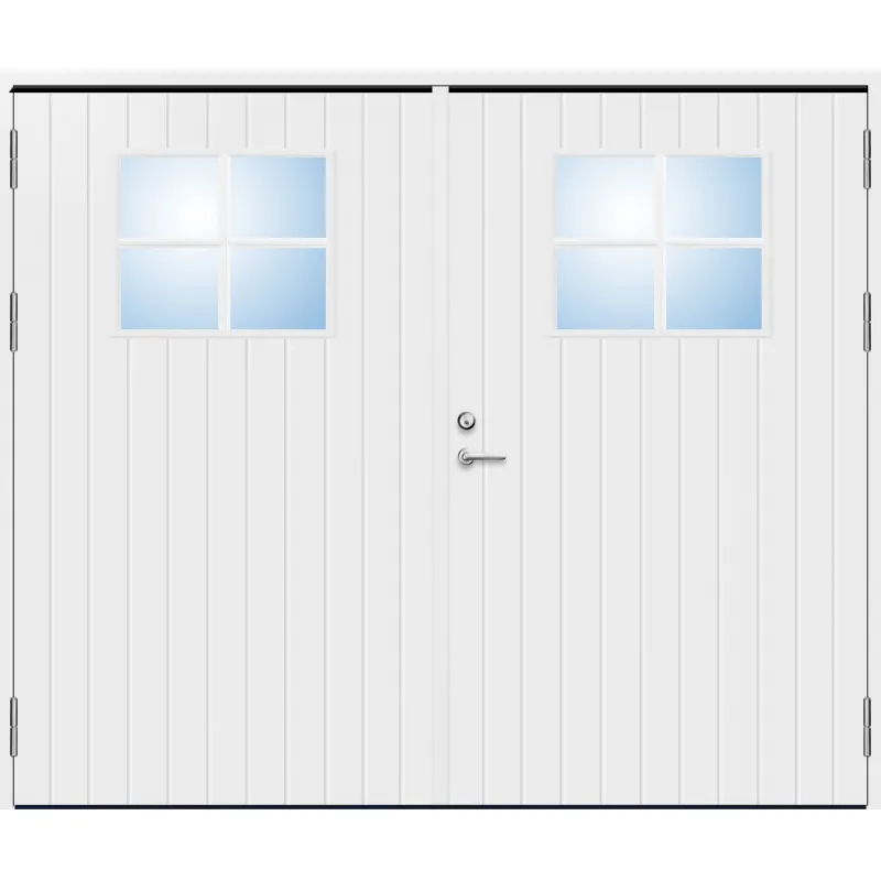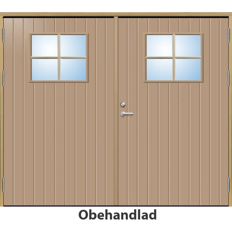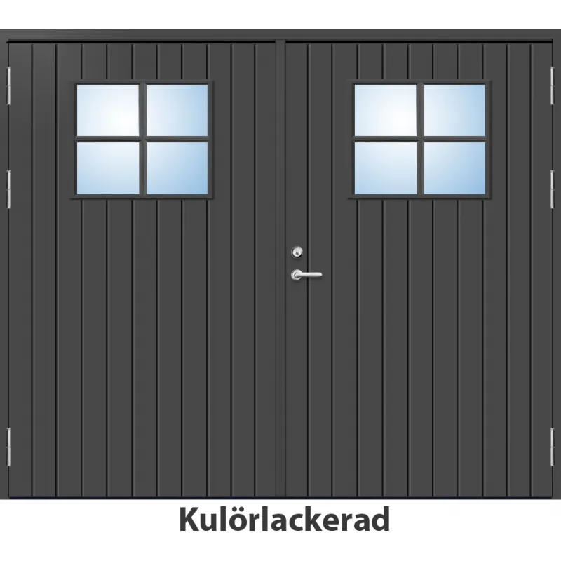 Parytterdörr med utvändiga skivor av HDF med tät stående spårning och glasparti i 21 graders ut..
