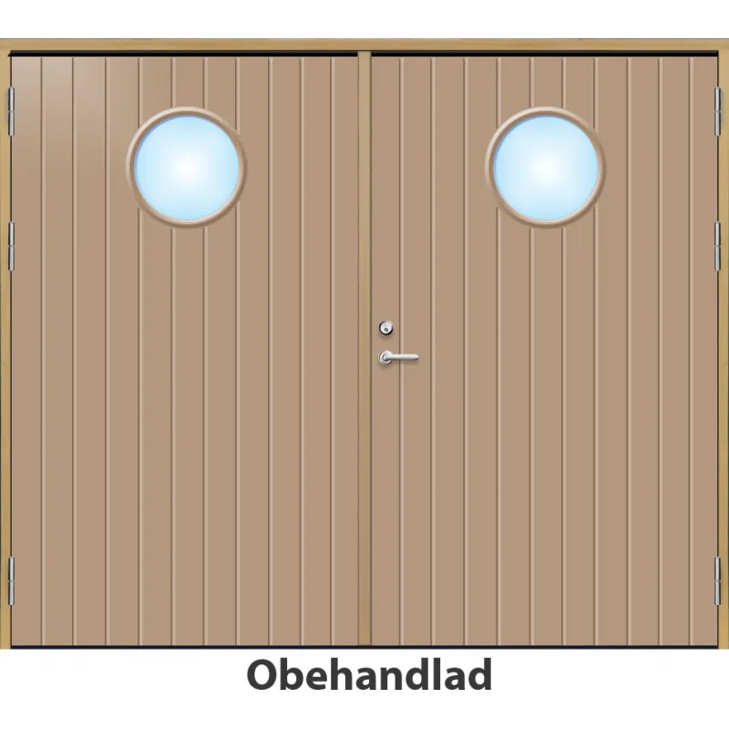 Parförrådsdörr med utvändiga skivor av HDF med tät stående spårning och runt glas i 18 graders utför..
