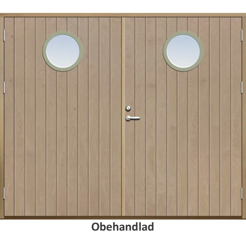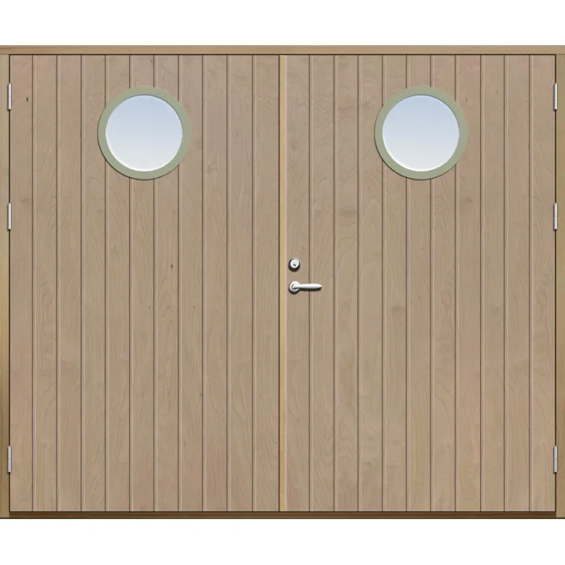 Parytterdörr med tät stående spårning och runt glas.Rejäla dörrblad med tjocklek på 73 mm, inbyggda ..