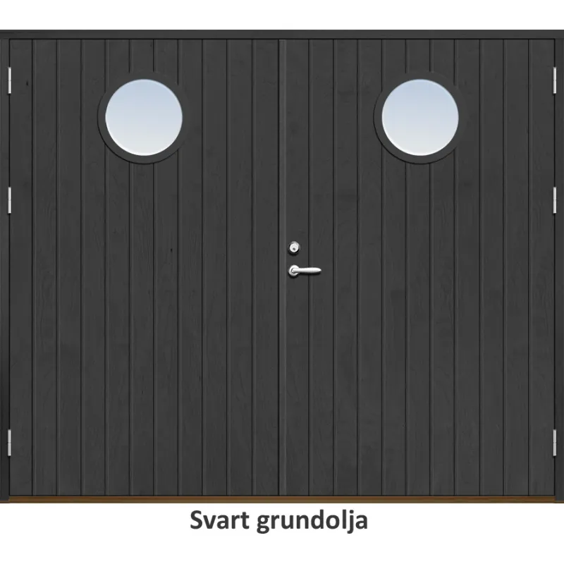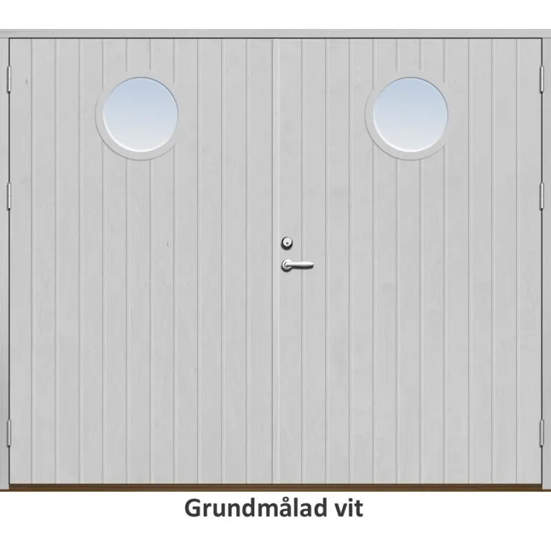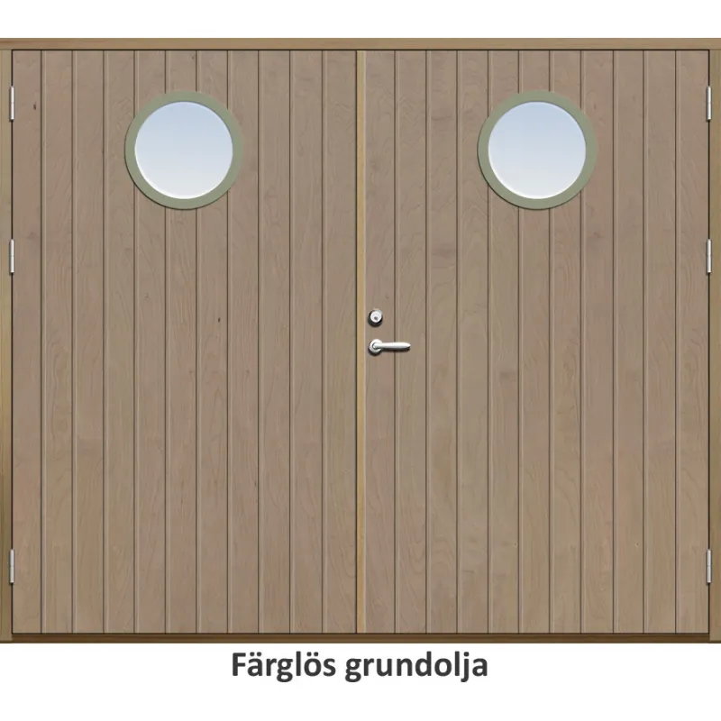 Parförrådsdörr med utvändiga skivor av HDF med tät stående spårning och runt glas i 18 graders utför..
