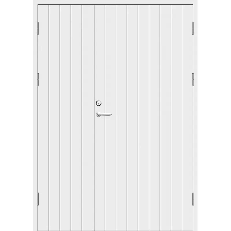 Stallpardörr med utvändiga skivor av HDF med tät stående spårning. (ca 100 mm C/C mellan spåren)